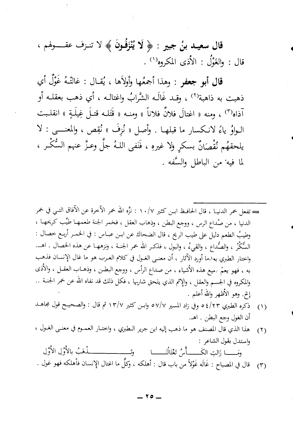 قال سعيد بن جبير (لا ينزفون) لا تنزف عقولهم قالوا والغول الأذى المكروه قال أبو جعفر وهذا أجمعها أو أولادها يقال غالته غول أي ذهبت به ذاهبة وقد غاله الشراب واغتاله أي ذهب بعقله أو آذاه ومنه اغتال فلان فلانا ومنه قتله قتل غيلة انقلبت الواو ياء لانكسار ما قبلها وأصل نزف نقص والمعنى لا يلحقهم نقصان بسكر ولا غيره فنفى الله جل وعز عنهم السكر لما فيه من الباطل والسفه