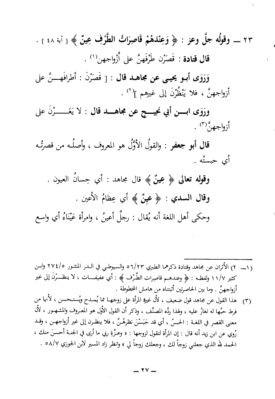 23 - وقوله جل وعز (وعندهم قاصرات الطرف عين) (آية 48) قال قتادة قصرن طرفهن على أزواجهن وروى أبو يحيى عن مجاهد قال قصرن أطرافهن على أزواجهن فلا ينظرن إلى غيرهم وروى ابن أبي نجيح عن مجاهد قال لا يغرن على أزواجهن قال أبو جعفر والقول الأول هو المعروف وأصله من قصرته أي حبسته وقوله تعالى (عين) قال مجاهد أي حسان العيون وقال السدي (عين) أي عظام الأعين وحكى أهل اللغة أنه يقال رجل أعين وامرأة عيناء أي واسع