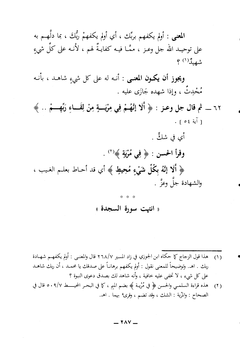 ويجوز أن يكون المعنى أنه له على كل شئ شاهد بانه محدث وإذا شهده جازى عليه 62 - ثم قال جل وعز (ألا إنهم في مرية من لقاء ربهم) (آية 54) أي في شك وقرأ الحسن (في مرية) (الا إنه بكل شئ محيط) أي قد أحاط بعلم الغيب والشهادة جل وعز انتهت سورة السجدة