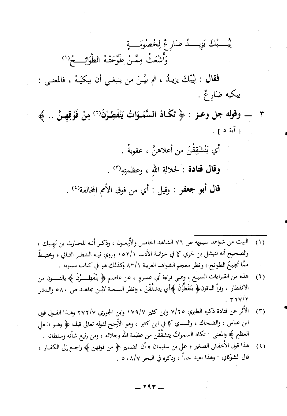 ليبك يزيد ضارع لخصومة * وأشعث ممن طوحته الطوائح فقال ليبك يزيد ثم بين من ينبغي أن يبكيه فالمعنى يبكيه ضارع 3 - وقوله جل وعز (تكاد السموات ينفطرن من فوقهن) (آية 5) أي ينشققن كما من أعلاهن عقوبة وقال قتادة لجلالة الله وعظمته قال أبو جعفر وقيل أي من فوق الأمم المخالفة
