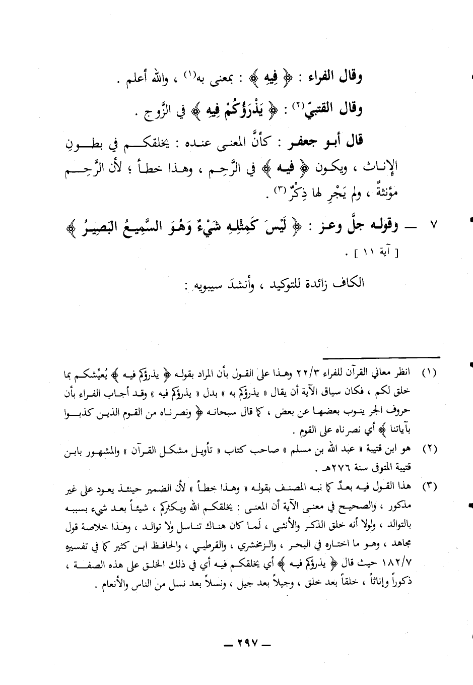 وقال الفراء (فيه) بمعنى به والله اعلم وقال القتبي (يذرؤكم فيه) في الزوج قال أبو جعفر كأن المعنى عنده يخلقكم في بطون الإناث ويكون (فيه) في الرحم وهذا خطأ لأن الرحم مؤنثة ولم يجر لها ذكر 7 - وقوله جل وعز (ليس كمثله شئ وهو السميع البصير) (آية 11) الكاف زائدة التوكيد وأنشد سيبويه: