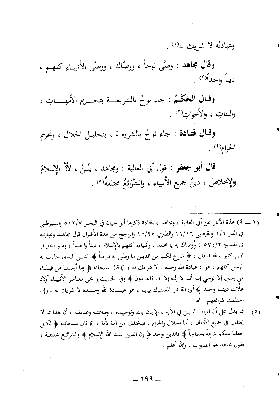 وعبادته لا شريك له وقال مجاهد وصى نوحا ووصاك ووصى الأنبياء كلهم دينا واحدا وقال الحكم جاء نوح بالشريعة بتحريم الأمهات والبنات والأخوات وقال قتادة جاء نوح بالشريعة بتحليل الحلال وتحريم الحرام قال أبو جعفر قول أبي العالية ومجاهد بين لأن الإسلام والإخلاص دين جميع الأنبياء والشرائع مختلفة