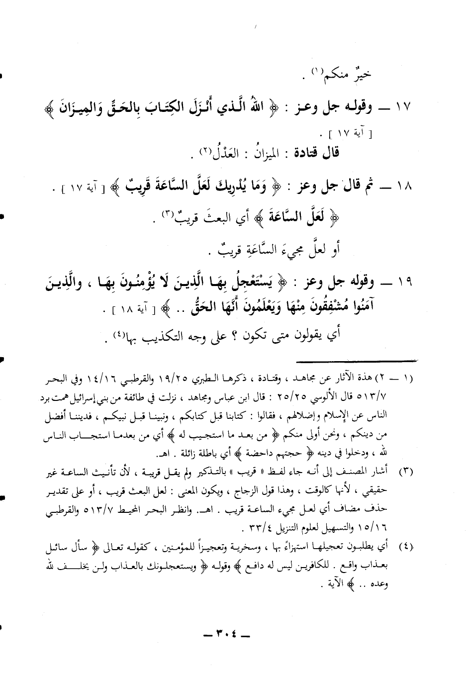 قال قتادة الميزان العدل 18 - ثم قال جل وعز (وما يدريك لعل الساعة قريب) (آية 17) (لعل الساعة) أي البعث قريب أو لعل مجئ الساعة قريب 19 - وقوله جل وعز (يستعجل بها الذين لا يؤمنون بها والذين آمنوا مشفقون منها ويعلمون أنها الحق) (آية 18) أي يقولون متى تكون على وجه التكذيب بها
