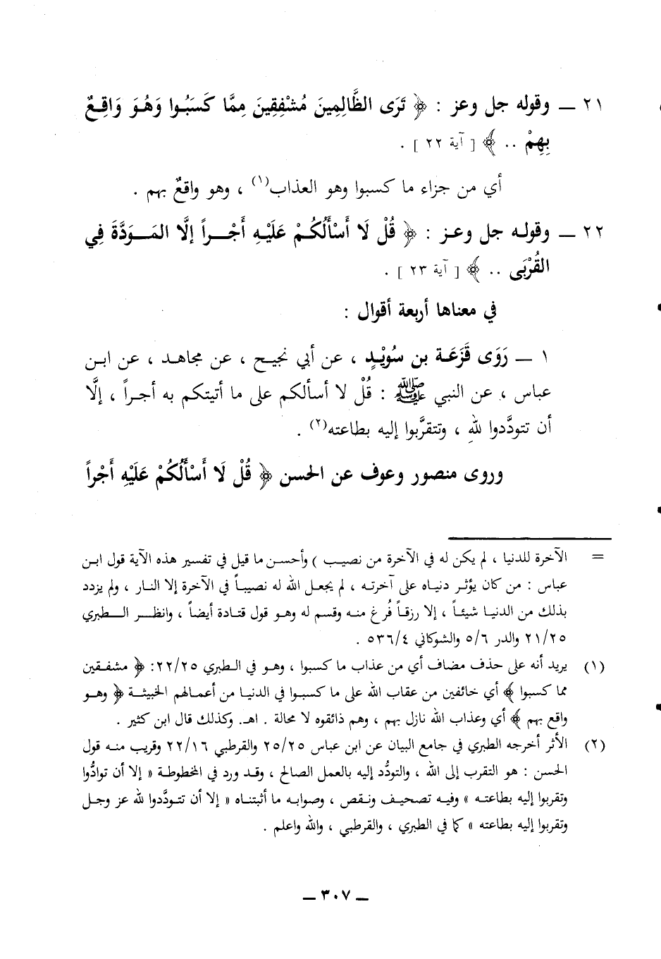 21 - وقوله جل وعز (ترى الظالمين مشفقين مما كسبوا وهو واقع بهم) (آية 22) أي من جزاء ما كسبوا وهو العذاب وهو واقع بهم 22 - وقوله جل وعز (قل لا أسألكم عليه أجرا إلا المودة في القربى) (آية 23) في معناها أربعة أقوال: 1 - روى قزعة بن سويد عن أبي نجيح عن مجاهد عن ابن عباس عن النبي صلى الله عليه وسلم قل لا أسألكم على ما أتيتكم به أجرا إلا أن تتوددوا لله وتتقربوا إليه بطاعته وروى منصور وعوف عن الحسن (قل لا أسألكم عليه أجرا