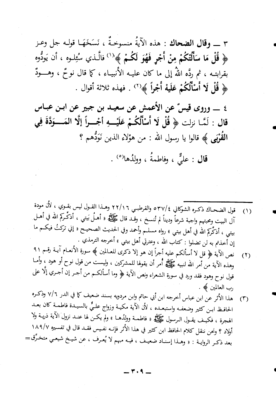 3 - وقال الضحاك هذه الآية منسوخة نسخها قوله جل وعز (قل ما سألتكم من أجر فهو لكم) فالذي سئلوه أن يودوه بقرابته ثم رده الله إلى ما كان عليه الأنبياء كما قال نوح وهود (قل لا أسألكم عليه أجرا) فهذه ثلاثة أقوال 4 - وروى قيس عن الأعمش عن سعيد بن جبير عن ابن عباس قال لما نزلت (قل لا أسألكم عليه أجرا إلا المودة في القربى) قالوا يا رسول الله من هؤلاء الذين نودهم؟ قال علي وفاطمة وولدها