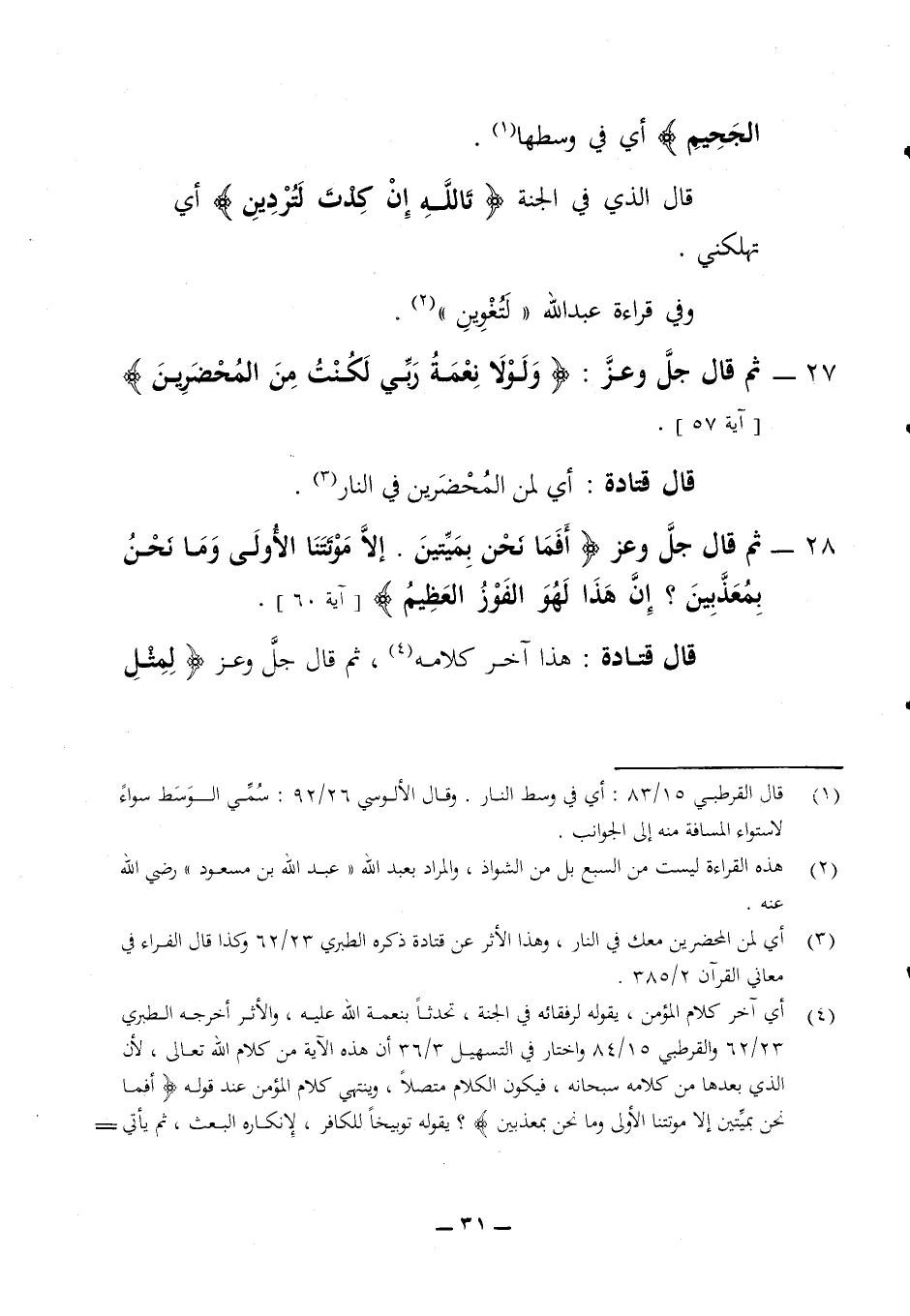 قال قتادة أي لمن المحضرين في النار ثم قال جل وعز (أفما نحن بميتين إلا موتتنا الأولى وما نحن بمعذبين إن هذا لهو الفوز العظيم) (آية 60) قال قتادة هذا آخر كلامه ثم قال جل وعز (لمثل