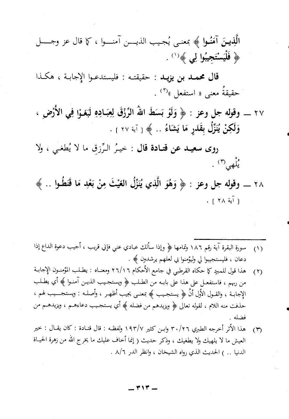 الذين آمنوا) بمعنى يجيب الذين آمنوا كما قال عز وجل (فليستجيبوا لي) قال محمد بن يزيد حقيقته فليستدعوا فيه الإجابة هكذا حقيقة معنى (استفعل) 27 - وقوله جل وعز (ولو بسط الله الرزق لعباده لبغوا في الأرض ولكن ينزل بقدر ما يشاء) (آية 27) روى سعيد عن قتادة قال خير الرزق ما لا يطغي ولا يلهي 28 - وقوله جل وعز (وهو الذي ينزل الغيث من بعد ما قنطوا) (آية 28)