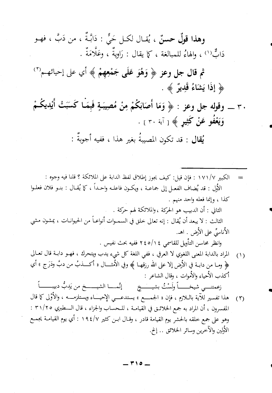 وهذا قول حسن يقال لكل حي دابة من دب فهو داب والهاء للمبالغة كما يقال رواية وعلامة ثم قال جل وعز (وهو على جمعهم) أي على إحيائهم (إذا يشاء قدير) 30 - وقوله جل وعز (وما أصابكم من مصيبة فبما كسبت أيديكم ويعفو عن كثير) (آية 30) يقال قد تكون المصيبة بغير هذا ففيه أجوبة:
