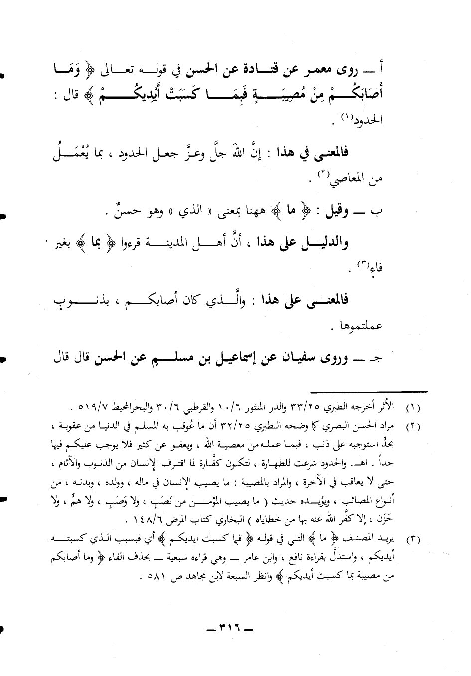 1 - أروى معمر عن قتادة عن الحسن في قوله تعالى (وما أصابكم من مصيبة فبما كسبت أيديكم) قال الحدود فالمعنى في هذا إن الله جل وعز جعل الحدود بما يعمل من المعاصي ب - وقيل ما ههنا بمعنى (الذي) وهو حسن والدليل على هذا أن أهل المدينة قرؤوا (بما) بغير فاء فالمعنى على هذا والذي كان أصابكم بذنوب عملتموها ج - وروى سفيان عن إسماعيل بن مسلم عن الحسن قال قال