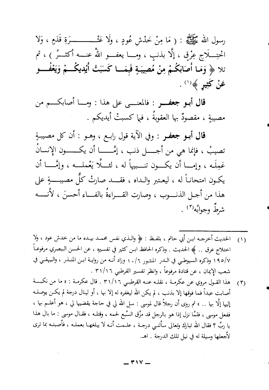رسول الله صلى الله عليه وسلم (ما من خدش عود ولا عثرة قدم ولا اختلاج عرق إلا بذنب وما يعفو الله عنه أكثر) ثم تلا (وما أصابكم من مصيبة فبما كسبت أيديكم ويعفو عن كثير) قال أبو جعفر فالمعنى على هذا وما أصابكم من مصيبة مقصود بها العقوبة فبما كسبت أيديكم قال أبو جعفر وفي الآية قول رابع وهو أن كل مصيبة تصيب فإنما هي من اجل ذنب إما أن يكون الإنسان عمله وإما أن يكون تنبيها له لئلا يعمله وإما أن يكون امتحانا له ليعتبر والداه فقد صارت كل مصيبة على هذا من أجل الذنوب وصارت القراءة بالفاء أحسن لأنه شرط وجوابه
