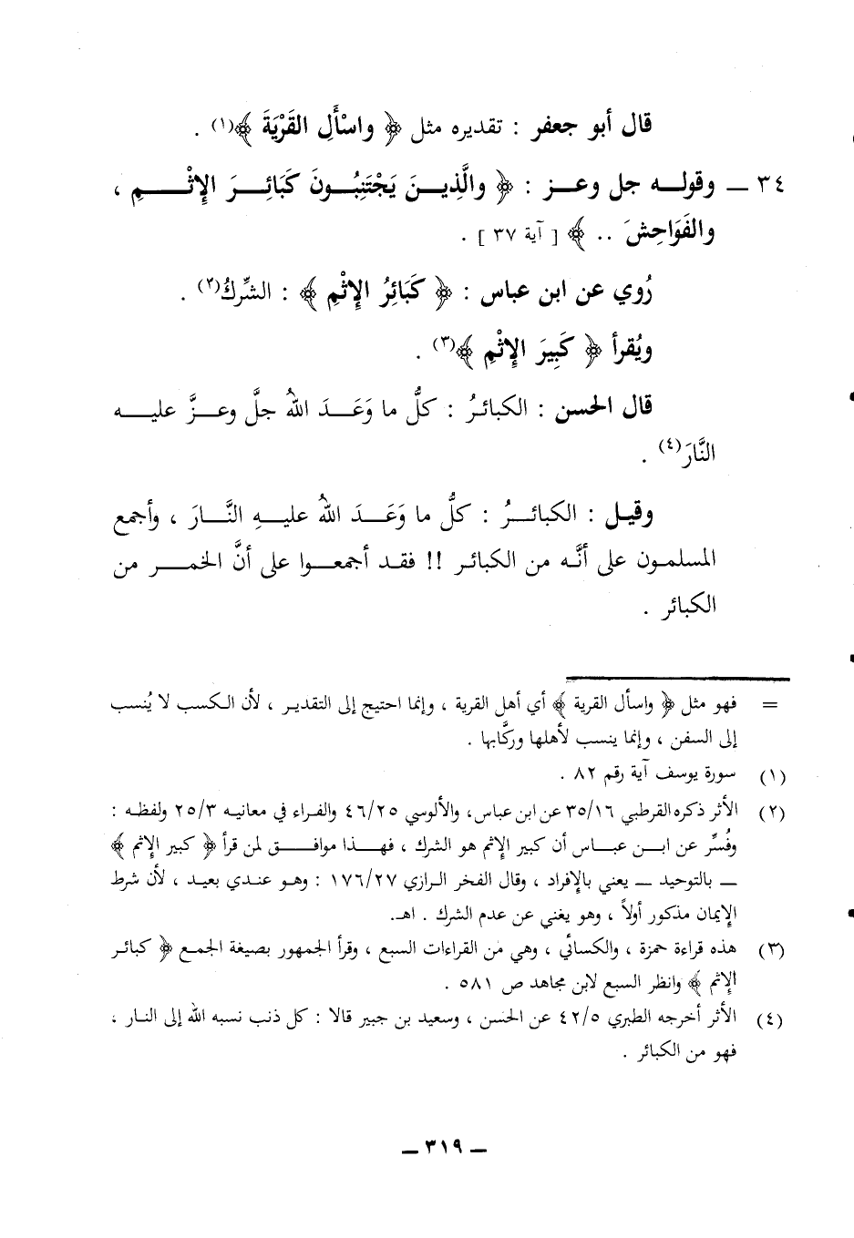 قال أبو جعفر تقديره مثل (واسأل القرية) 34 - وقوله جل وعز (والذين يجتنبون كبائر الإثم والفواحش) (آية 37) روي عن ابن عباس (كبائر الإثم) الشرك ويقرأ (كبير الإثم) قال الحسن الكبائر كل ما وعد الله جل وعز عليه النار وقيل الكبائر كل ما وعد الله عليه النار وأجمع المسلون على أنه من الكبائر فقد أجمعوا على أن الخمر من الكبائر