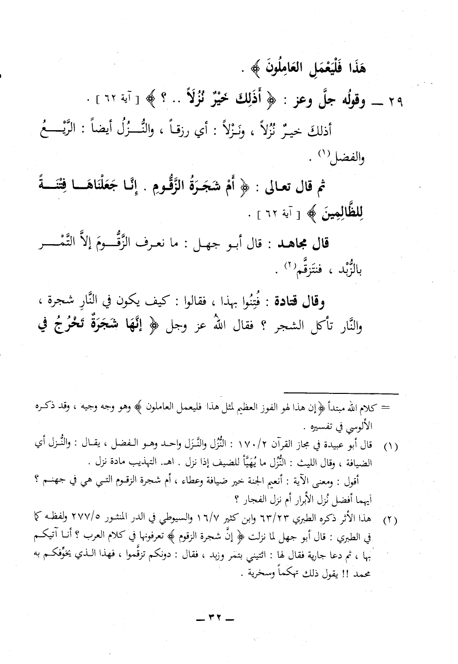 هذا فليعمل العاملون) وقوله جل وعز (أذلك خير نزلا) (آية 62) أذلك خير نزلا ونزلا أي رزقا والنزل أيضا الريع والفضل ثم قال تعالى (أم شجرة الزقوم إنا جعلناها فتنة للظالمين) (آية 62) قال مجاهد قال أبو جهل ما نعرف الزقوم إلا التمر بالزبد فنتزقم وقال قتادة فتنوا بهذا فقالوا كيف يكون في النار شجرة والنار تأكل الشجر فقال الله عز وجل (إنها شجرة تحرج في