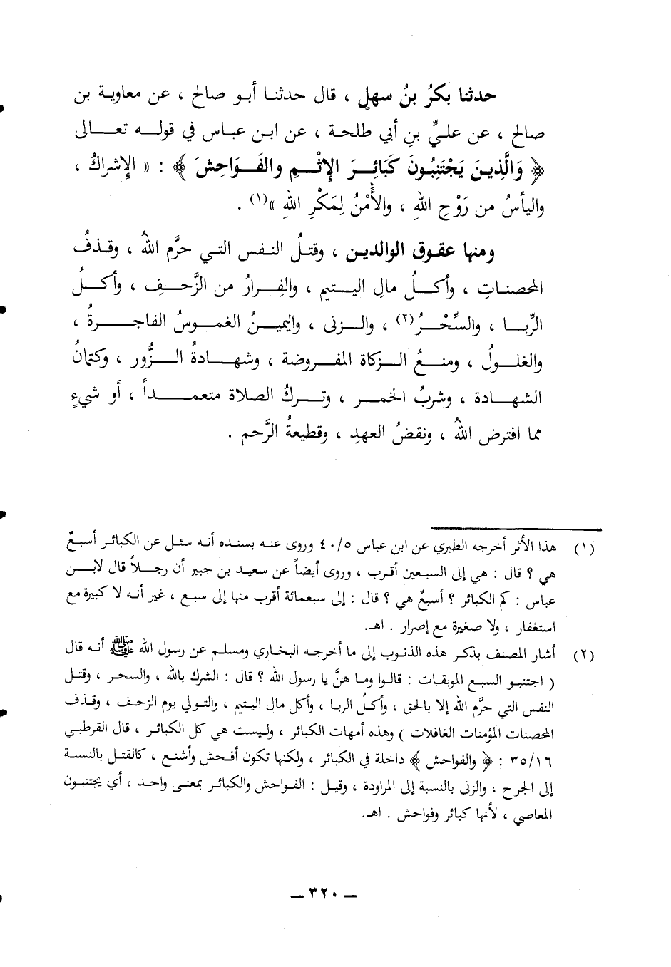 حدثنا بكر بن سهل قال حدثنا أبو صالح عن معاوية بن صالح عن علي بن أبي طلحة عن ابن عباس في قوله تعالى (والذين يجتنبون كبائر الإثم والفواحش) الإشراك واليأس من روح الله والأمن لمكر الله ومنه عقوق الوالدين وقتل النفس التي حرم الله وقذف المحصنات وأكل مال اليتيم والفرار من الزحف وأكل