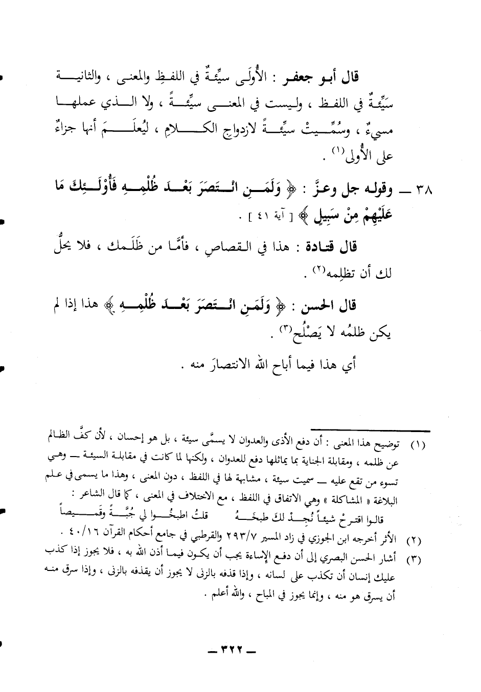 قال أبو جعفر الأولى سيئة في اللفظ والمعنى والثانية سيئة في اللفظ وليست في المعنى سيئة ولا الذي عملها مسئ وسميت سيئة لازدواج الكلام ليعلم إنها جزاء على الأولى 38 - وقوله جل وعز (ولمن انتصر بعد ظلمه فأولئك ما
