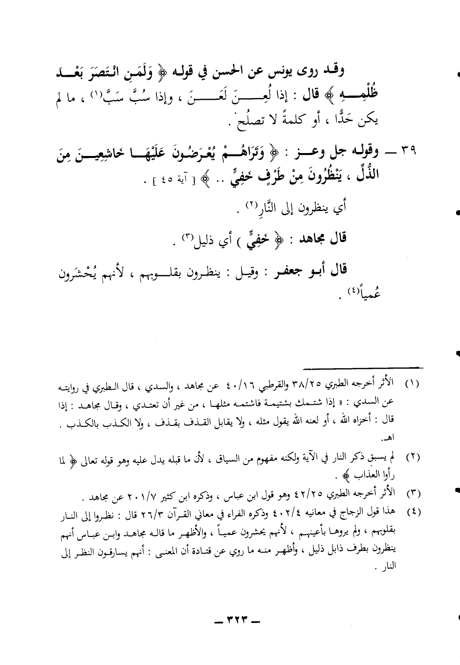 وقد روى يونس عن الحسن في قوله (ولمن انتصر بعد ظلمه) قال إذا لعن لعن وإذا سب سب ما لم يكن حدا أو كلمة لا تصلح 39 - وقوله جل وعز (وتراهم يعرضون عليها خاشعين من الذل ينظرون من طرف خفي) (آية 45) أي ينظرون إلى النار قال مجاهد (خفي) أي ذليل قال أبو جعفر وقيل ينظرون بقلوبهم لأنهم يحشرون عميا