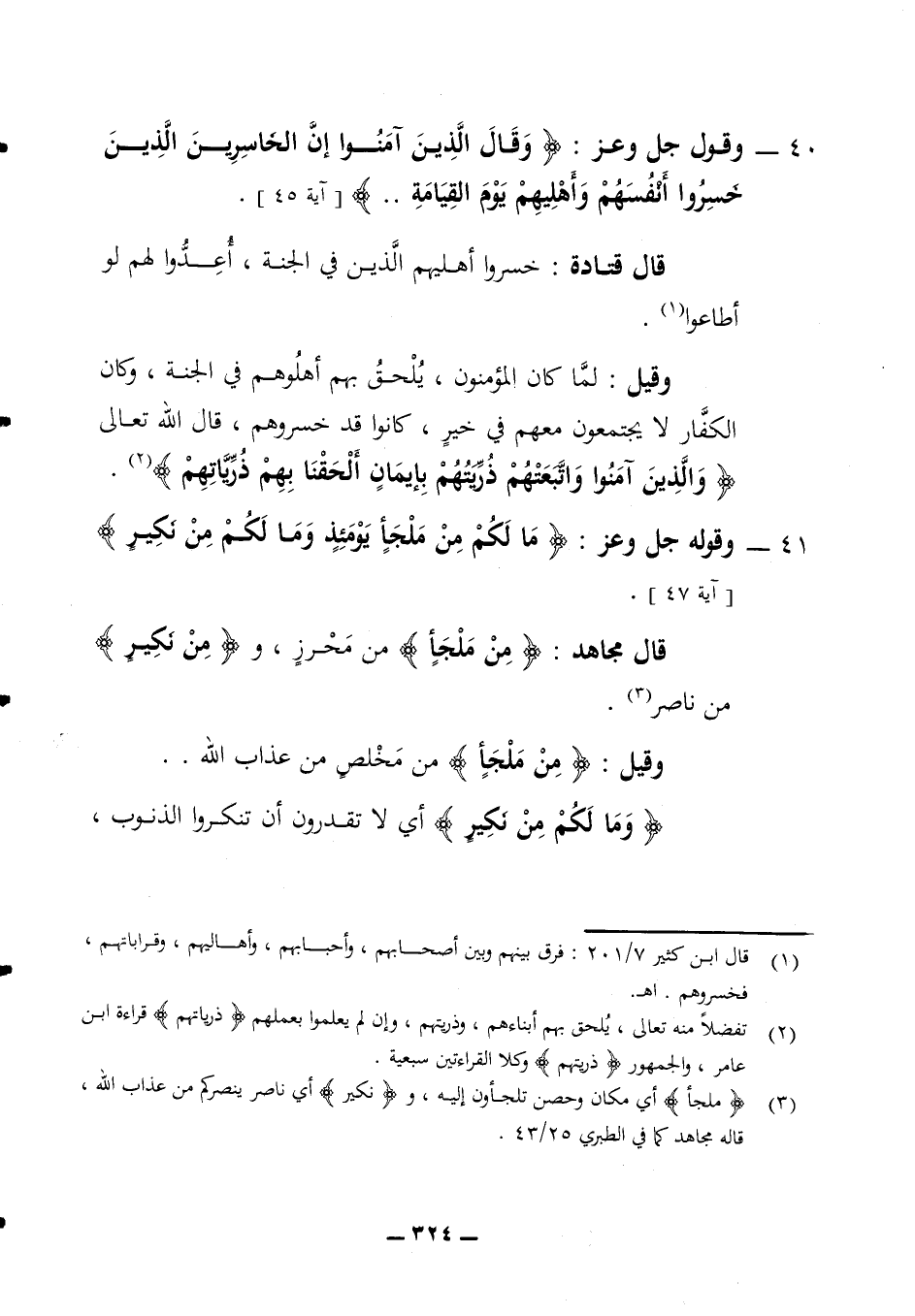الكفار لا يجتمعون معهم في خير كانوا قد خسروهم قال الله تعالى (والذين آمنوا واتبعتهم ذريتهم بإيمان ألحقنا بهم ذرياتهم) 41 - وقوله جل وعز (ما لكم من ملجأ يومئذ وما لكم من نكير) (آية 47) قال مجاهد (من ملجأ) من محرز و (من نكير) من ناصر وقيل (من ملجأ) من مخلص من عذاب الله (وما لكم من نكير) أي لا تقدرون أن تنكروا الذنوب