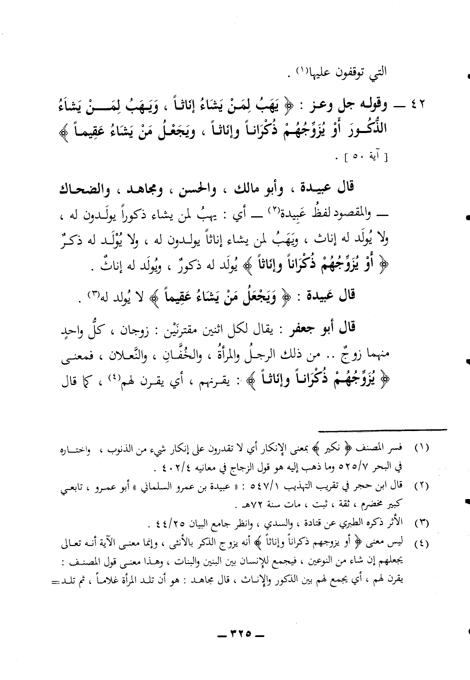التي توقفون عليها 42 - وقوله جل وعز (يهب لمن يشاء إناثا ويهب لمن يشاء الذكور أو يزوجهم ذكرانا وإناثا ويجعل من يشاء عقيما) (آية 50) قال عبيدة وأبو مالك والحسن ومجاهد والضحاك والمقصود لفظ عبيدة أي يهب لمن يشاء ذكورا يولدون له ولا يولد له إناث ويهب لمن يشاء إناثا يولدون له ولا يولد له ذكر (أو يزوجهم ذكرانا وإناثا) يولد له ذكور ويولد له إناث قال عبيدة (ويجعل من يشاء عقيما) لا يولد له قال أبو جعفر يقال لكل اثنين مقترنين زوجان كل واحد منهما زوج من ذلك الرجل والمرأة والخفان والنعلان فمعنى (يزوجهم ذكرانا وإناثا) يقرنهم أي يقرن لهم كما قال