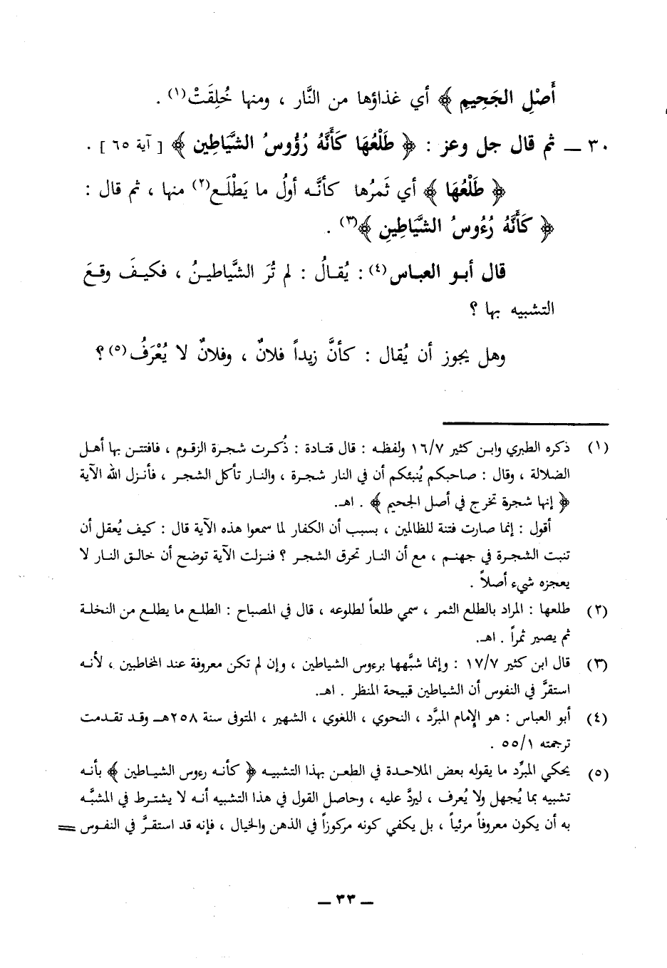 أصل الجحيم) أي غذاؤها من النار ومنها خلقت 30 - ثم قال جل وعز (طلعها كأنه رؤوس الشياطين) (آية 65) (طلعها) أي ثمرها كأنه أول ما يطلع منها ثم قال (كأنه رؤوس الشياطين) قال أبو العباس يقال لم تر الشياطين فكيف وقع التشبيه بها؟