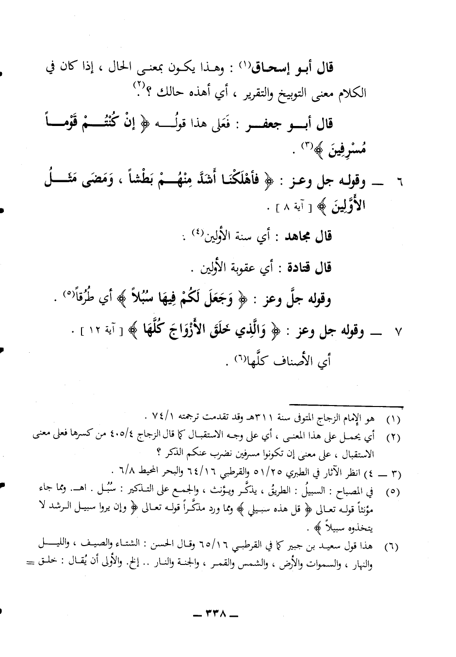 قال أبو إسحاق وهذا يكون بمعنى الحال إذا كان في الكلام معنى التوبيخ والتقرير اي أهذه حالك؟ قال أبو جعفر فعلى هذا قوله (إن كنتم قوما مسرفين) 6 - وقوله جل وعز (فأهلكنا أشد منهم بطشا ومضى مثل الأولين) (آية 8) قال مجاهد أي سنة الأولين قال قتادة أي عقوبة الأولين وقوله جل وعز (وجعل لكم فيها سبلا) أي طرقا 7 - وقوله جل وعز (والذي خلق الأزواج كلها) (آية 12)