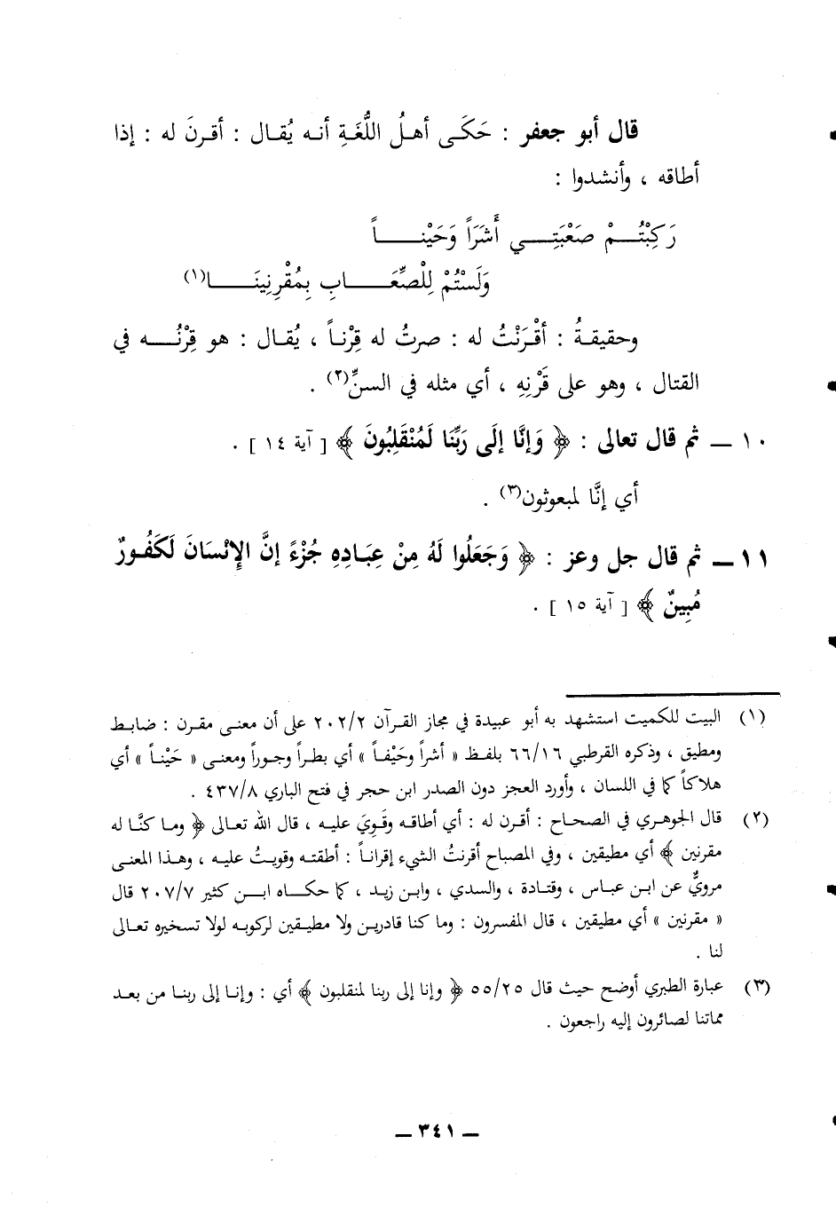 أطاقه وأنشدوا: ركبتم صعبتي أشرا وحينا * ولستم للصعاب بمقرنينا وحقيقة أقرنت له صرت له قرنا يقال هو قرنه في القتال وهو على قرنه أي مثله في السن 10 - ثم قال تعالى (وإنا إلى ربنا لمنقلبون) (آية 14) أي إنل أنه مبعوثون 11 - ثم قال جل وعز (وجعلوا له من عباده جزء إن الإنسان لكفور مبين) (آية 15)