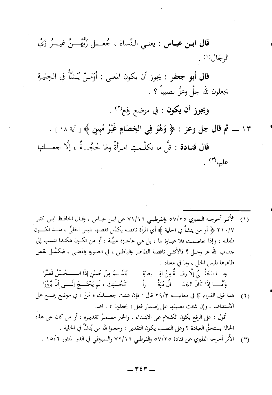 قال ابن عباس يعني النساء جعل زيهن غير زي الرجال قال أبو جعفر يجوز ن يكون المعنى أو من ينشأ في الحلية