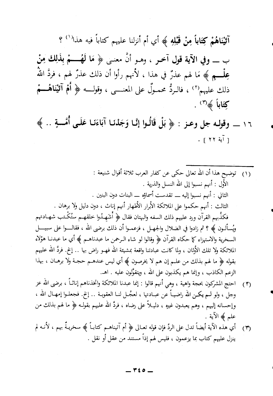 ب - وفي الآية قول آخر وهو أن معنى (ما لهم بذلك من علم) ما لهم عذر في هذا لأنهم رأوا أن ذلك عذر لهم فرد الله ذلك عليهم فالرد محمول على المعنى وقوله (أم آتيناهم كتابا) 16 - وقوله جل وعز (بل قالوا إنا وجدنا آباءنا على أمة) (آية 22)