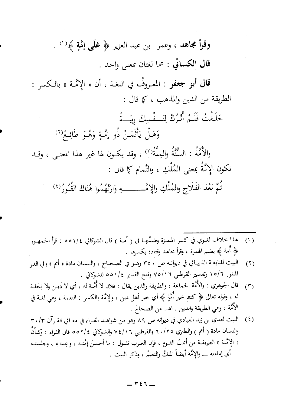وقرأ مجاهد وعمر بن عبد العزيز (على إمة) قال الكسائي هما لغتان بمعنى واحد قال أبو جعفر المعروف في اللغة أن الإمة بالكسر الطريقة من الدين والمذهب كما قال: حلفت فلم أترك لنفسك ريبة * وهل يأثمن ذو امة وهو طائع والأمة السنة والملة وقد يكون لها غير هذا المعنى وقد تكون الإمة بمعنى الملك والتمام كما قال: ثم بعد الفلاح والملك والإمة وارتهموا وهو هناك القبور