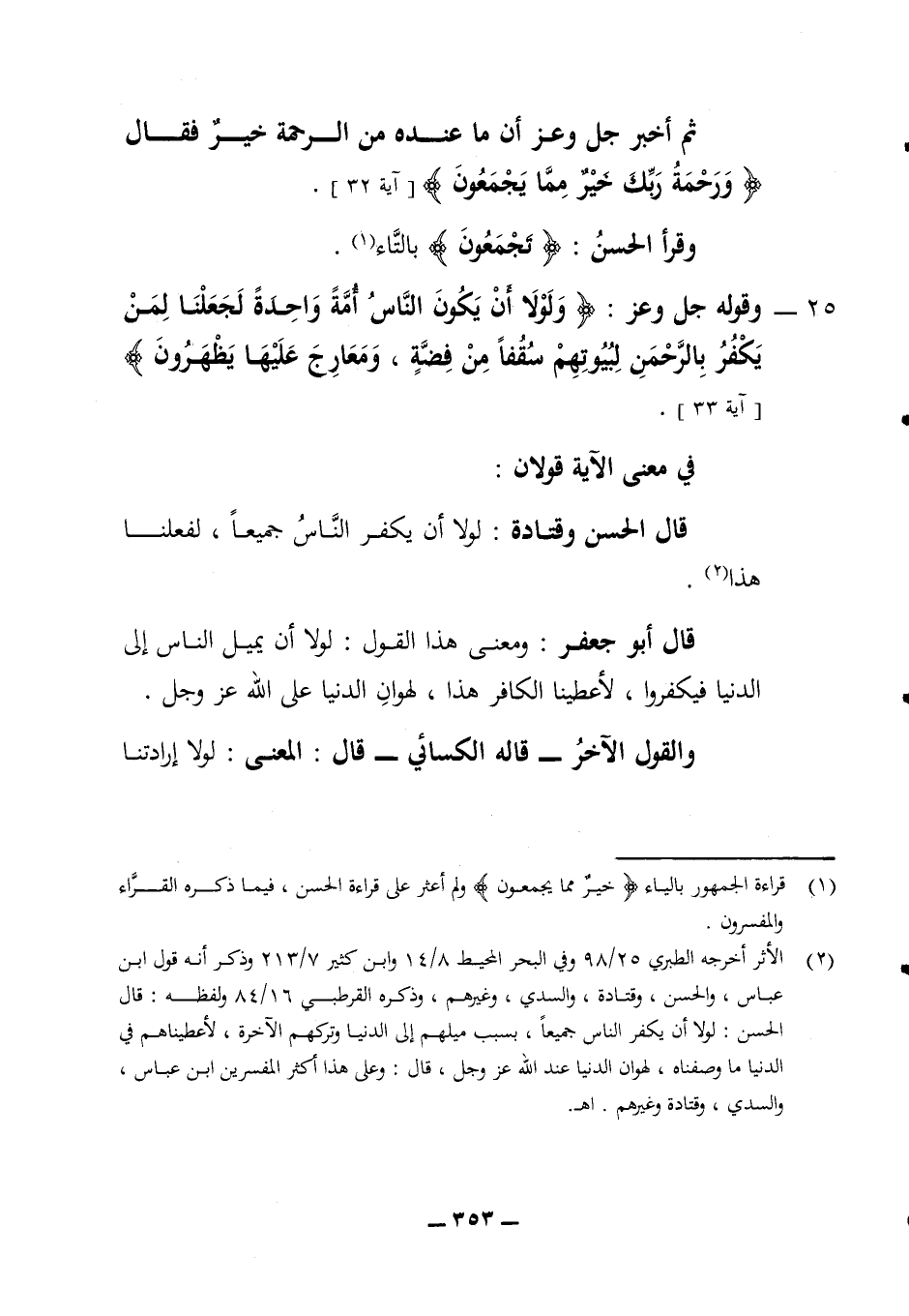 ثم أخبر جل وعز أن ما عنده من الرحمة خير فقال (ورحمة ربك خير مما يجمعون) (آية 32) وقرأ الحسن (تجمعون) بالتاء 25 - وقوله جل وعز (ولولا أن يكون الناس أمة واحدة لجعلنا لمن يكفر بالرحمن لبيوتهم سقفا من فضة ومعارج عليها يظهرون) (آية 33) في معنى الآية قولان: قال الحسن وقتادة لولا ان يكفر الناس جميعا لفعلنا هذا قال أبو جعفر ومعنى هذا القول لولا أن يميل الناس إلى الدنيا فيكفروا لأعطينا الكافر هذا لهوان الدنيا على الله عز وجل والقول الآخر قاله الكسائي قال المعنى لولا إرادتنا