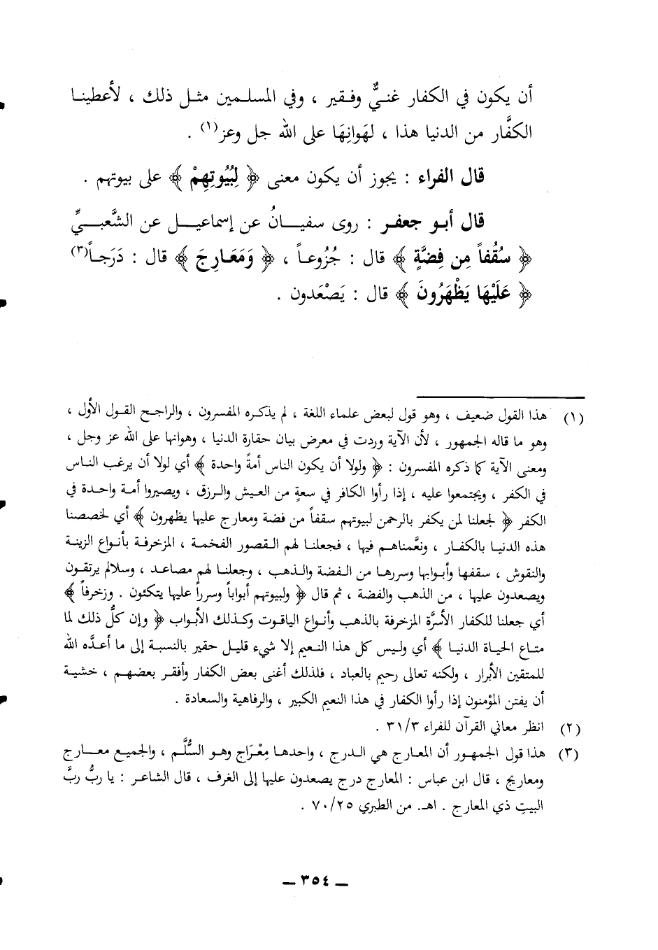 قال الفراء يجوز أن يكون معنى (لبيوتهم) على بيوتهم قال أبو جعفر روى سفيان عن إسماعيل عن الشعبي (سقفا من فضة) قال جزوعا (ومعارج) قال درجا (عليها يظهرون) قال يصعدون