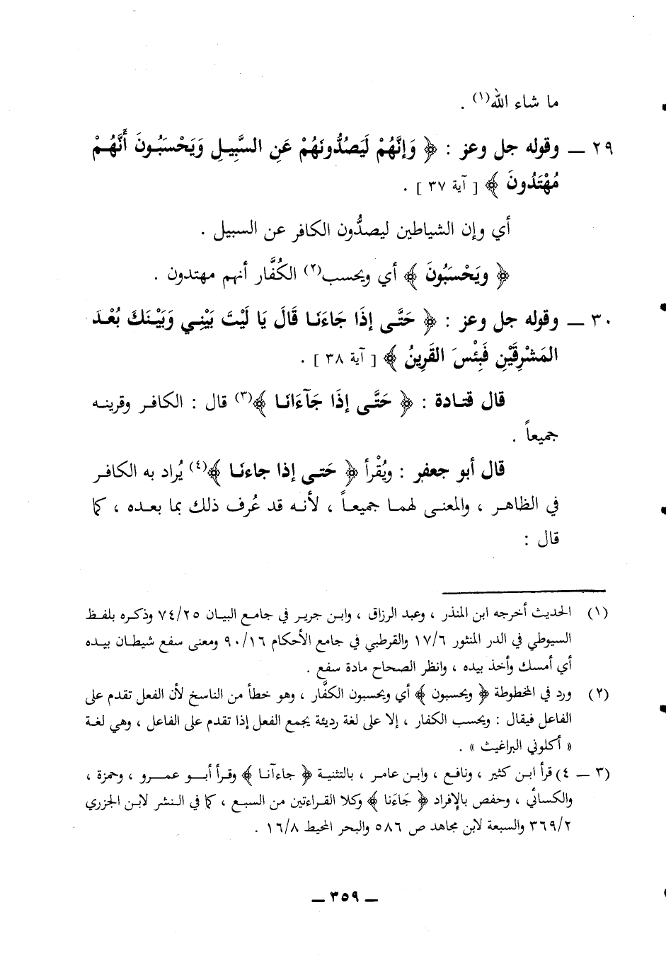 ما شاء الله 29 - وقوله جل وعز (وإنهم ليصدونهم عن السبيل ويحسبون أنهم مهتدون) (آية 37) أي وإن الشياطين ليصدون الكافر عن السبيل (ويحسبون) أي ويحسب الكفار أنهم مهتدون 30 - وقوله جل وعز (حتى إذا جاءنا قال يا ليت بيني وبينك بعد المشرقين فبئس القرين) (آية 38) قال قتادة (حتى إذا جاءآنا) قال الكافر وقرينه جميعا قال أبو جعفر ويقرأ (حتى إذا جاءنا) يراد به الكافر في الظاهر والمعنى لهما جميعا لأنه قد عرف ذلك بما بعده كما قال: