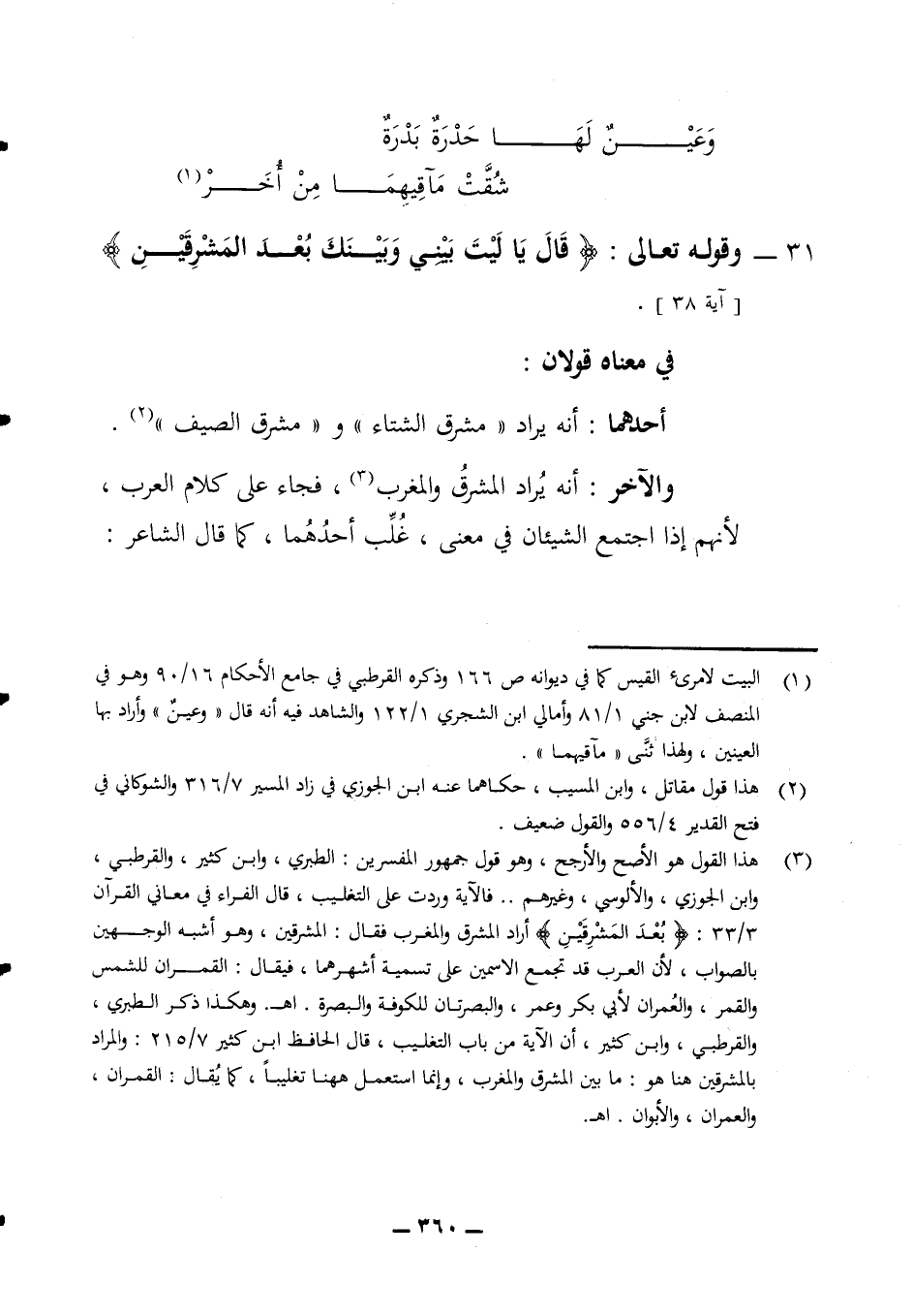 وعين لها حدرة بدرة * شقت مآقيهما من أخر 31 - وقوله تعالى (قال يا ليت بيني وبينك بعد المشرقين) (آية 38) في معناه قولان: أحدهما أنه يراد مشرق الشتاء ومشرق الصيف والآخر أنه يراد المشرق والمغرب فجاء على كلام العرب لأنهم إذا اجتمع الشيئان في معنى غلب أحدهما كما قال الشاعر: