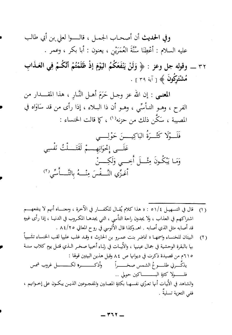 وفي الحديث أن أصحاب الجمل قالوا لعلي بن أبي طالب عليه السلام أعطنا سنة العمرين يعنون أبا بكر وعمر 32 - وقوله جل وعز (ولن ينفعكم اليوم إذ ظلمتم أنكم في العذاب مشتركون) (آية 39) المعنى إن الله عز وجل حرم أهل النار هذا المقدار من الفرح وهو التأسي وهو أن ذا البلاء إذا رأى من قد ساواه في المصيبة سكن ذلك من حزنه كما قالت الخنساء: فلولا كثرة الباكين حولي * على إخوانهم لقتلت نفسي وما يبكون مثل أخي ولكن * أعزي النفسي منه بالتأسي