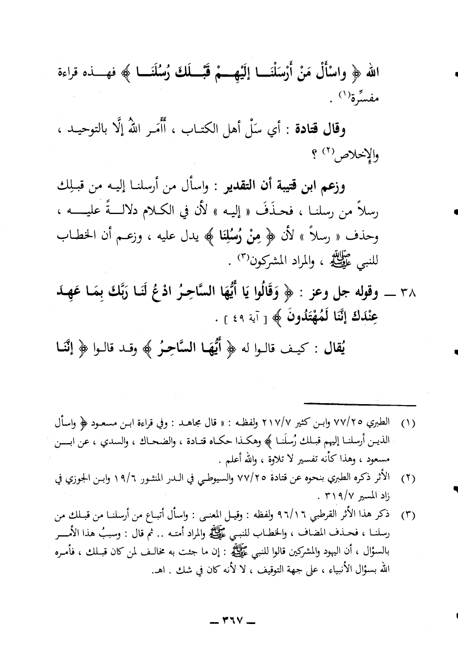 الله (واسأل من أرسلنا إليهم قبلك رسلنا) فهذه قراءة مفسرة وقال قتادة اي سل أهل الكتاب أأمر الله إلا بالتوحيد