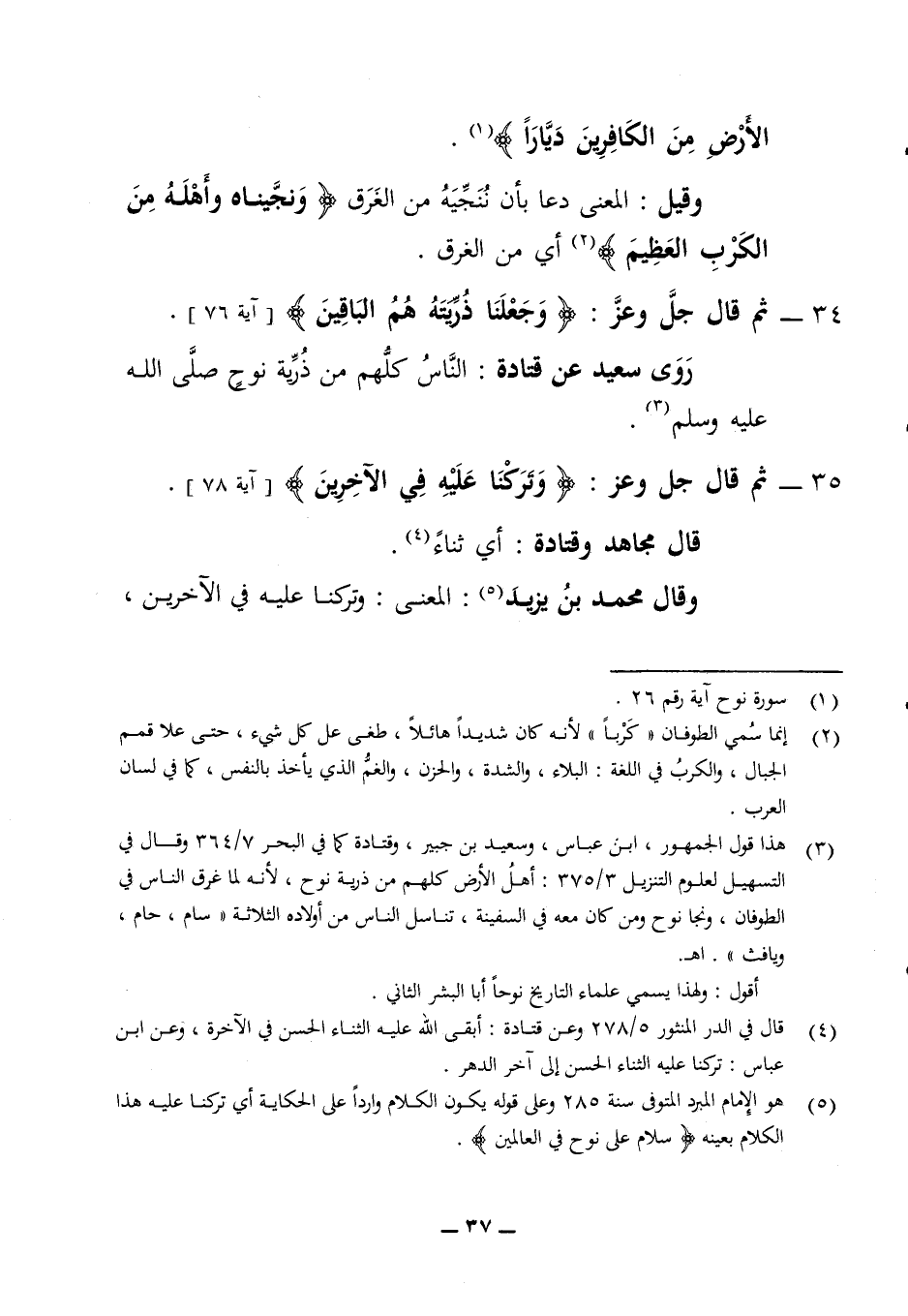 الأرض من الكافرين ديارا) وقيل المعنى دعا بأن ننجيه من الغرق (ونجيناه وأهله من الكرب العظيم) أي من الغرق 34 - ثم قال جل وعز (وجعلنا ذريته هم الباقين) (آية 76) روى سعيد عن قتادة الناس كلهم من ذرية نوح صلى الله عليه وسلم 35 - ثم قال جل وعز (وتركنا عليه في الآخرين) (آية 78) قال مجاهد وقتادة أي ثناء وقال محمد بن زيد المعنى وتركنا عليه في الآخرين