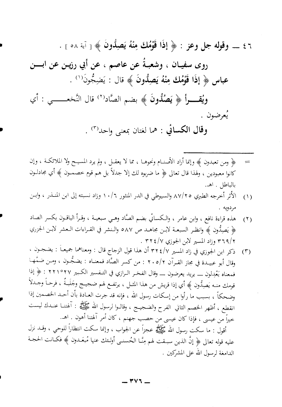 46 - وقوله جل وعز (إذ قومك منه يصدون) (آية 58) روى سفيان وشعبة عن عاصم عن ابي رزين عن ابن عباس (إذا قومك منه يصدون) قال يضجون ويقرأ (يصدون) بضم الصاد قال النخعي أي يعرضون وقال الكسائي هما لغتان بمعنى واحد