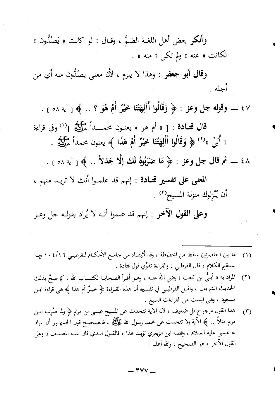 وأنكر بعض أهل اللغة الضم وقال لو كانت (يصدون) لكانت (عنه) ولم تكن (منه) وقال أبو جعفر وهذا لا يلزم لأن معنى يصدون منه أي من أجله 47 - وقوله جل وعز (وقالوا أآلهتنا خير أم هو) (آية 58) قال قتادة (أم هو) يعنون محمدا صلى الله عليه وسلم وفي قراءة أبي (وقالوا أآلهتنا خير أم هذا) يعنون محمدا صلى الله عليه وسلم 48 - ثم قال جل وعز (ما ضربوه لك إلا جدلا) (آية 58) المعنى على تفسير قتادة إنهم قد علموا أنك لا تريد منهم أن ينزلوك منزلة المسيح