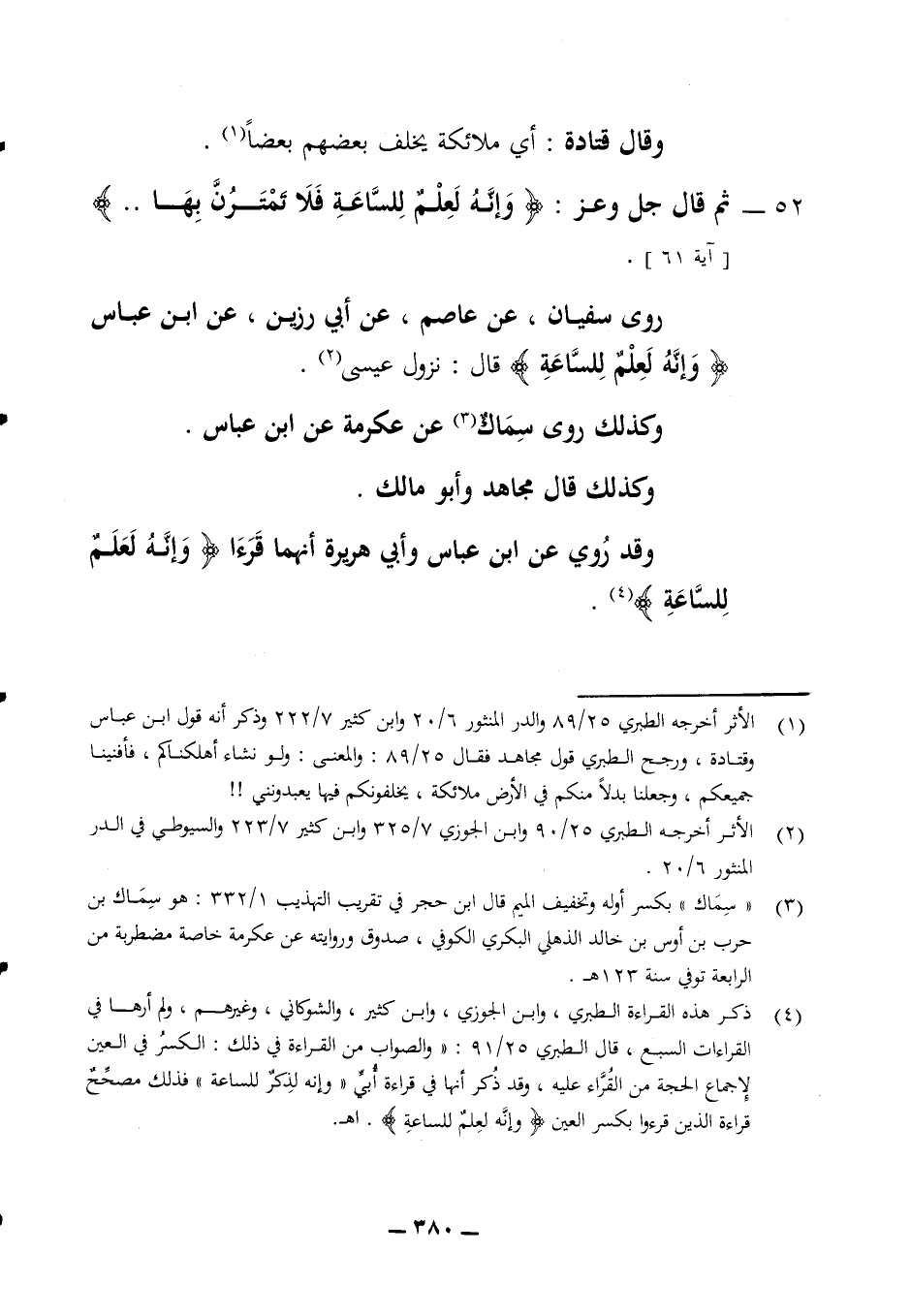 وقال قتادة أي ملائكة يخلف بعضهم بعضا 52 - ثم قال جل وعز (وإنه لعلم للساعة فلا تمترن بها) (آية 61) روى سفيان عن عاصم عن ابي رزين عن ابن عباس (وإنه لعلم للساعة) قال نزول عيسى وكذلك روى سماك عن عكرمة عن ابن عباس وكذلك قال مجاهد وأبو مالك وقد روي عن ابن عباس وابي هريرة أنهما قرءا (وإنه لعلم للساعة)