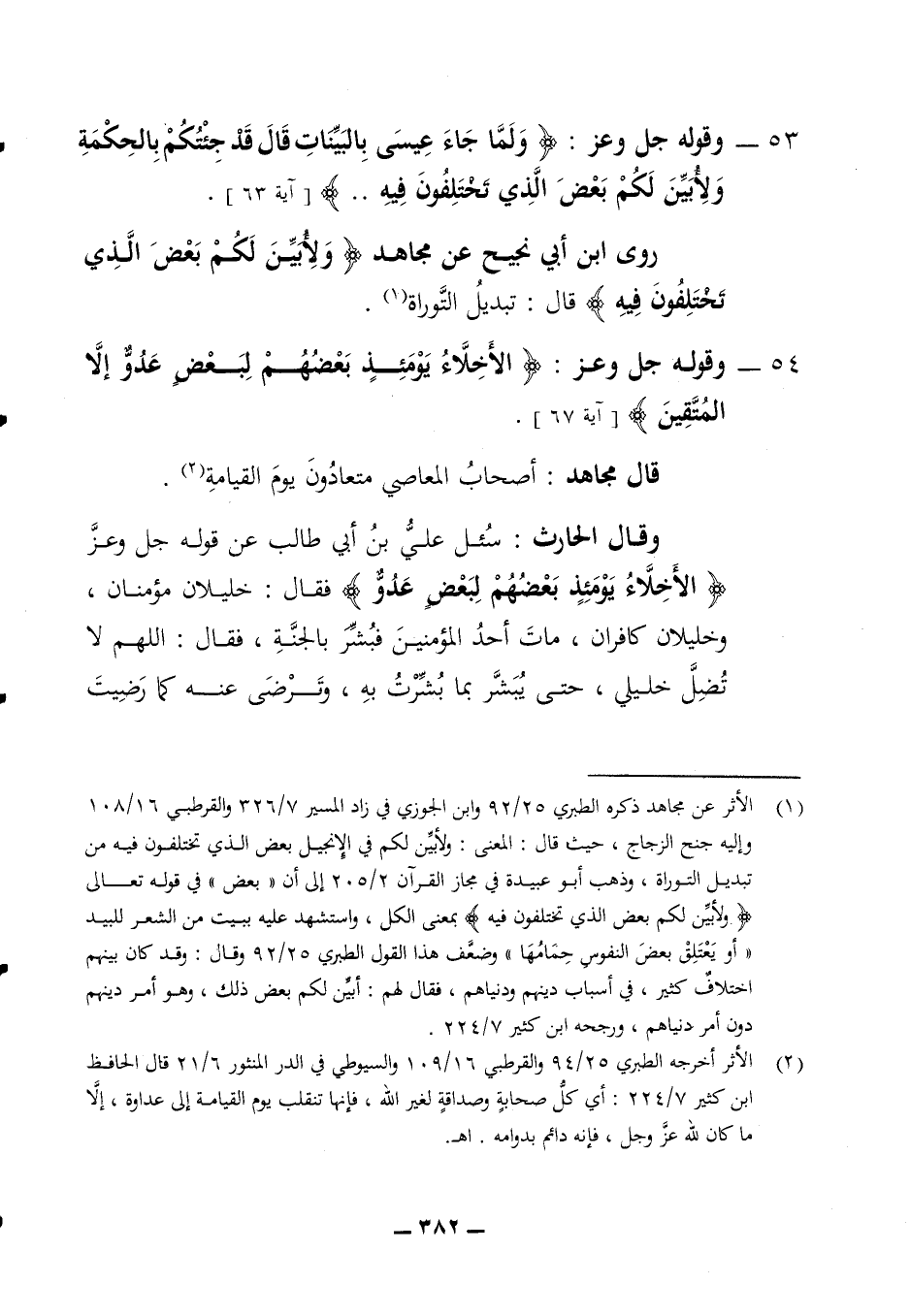53 - وقوله جل وعز (ولما جاء عيسى بالبينات قال قد جئتكم بالحكمة ولأبين لكم بعض الذي تختلفون فيه) (آية 63) روى ابن أبي نجيح عن مجاهد ولأبين لكم بعض الذي تختلفون فيه) قال تبديل التوراة 54 - وقوله جل وعز (الأخلاء يومئذ بعضهم لبعض عدو إلا المتقين) (آية 67) قال مجاهد أصحاب المعاصي متعادون يوم القيامة وقال الحارث سئل علي بن أبي طالب عن قوله جل وعز (الأخلاء يومئذ بعضهم لبعض عدو) فقال خليلان مؤمنان وخليلان كافران مات أحد المؤمنين فبشر بالجنة فقال اللهم لا تضل خليلي حتى يبشر بما بشرت به وترضى عنه كما رضيت
