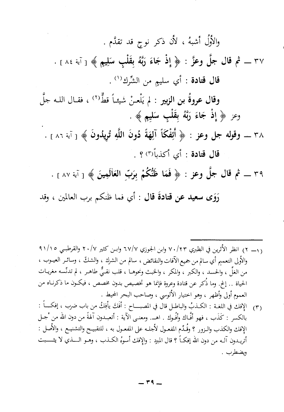 والأول أشبه لأن ذكر نوح قد تقدم 37 - ثم قال جل وعز (وإذ جاء ربه بقلب سليم) (آية 84) قال قتادة أي سليم من الشرك وقال عروة بن الزبير لم يلعن شيئا قط فقال الله جل وعز (إذ جاء ربه بقلب سليم) 38 - وقوله جل وعز (أئفكا آلهة دون الله تريدون) (آية 86) قال قتادة أي أكذبا 39 - ثم قال جل وعز (فما ظنكم برب العالمين) (آية 87) روى سعيد عن قتادة قال أي فما ظنكم برب العالمين وقد