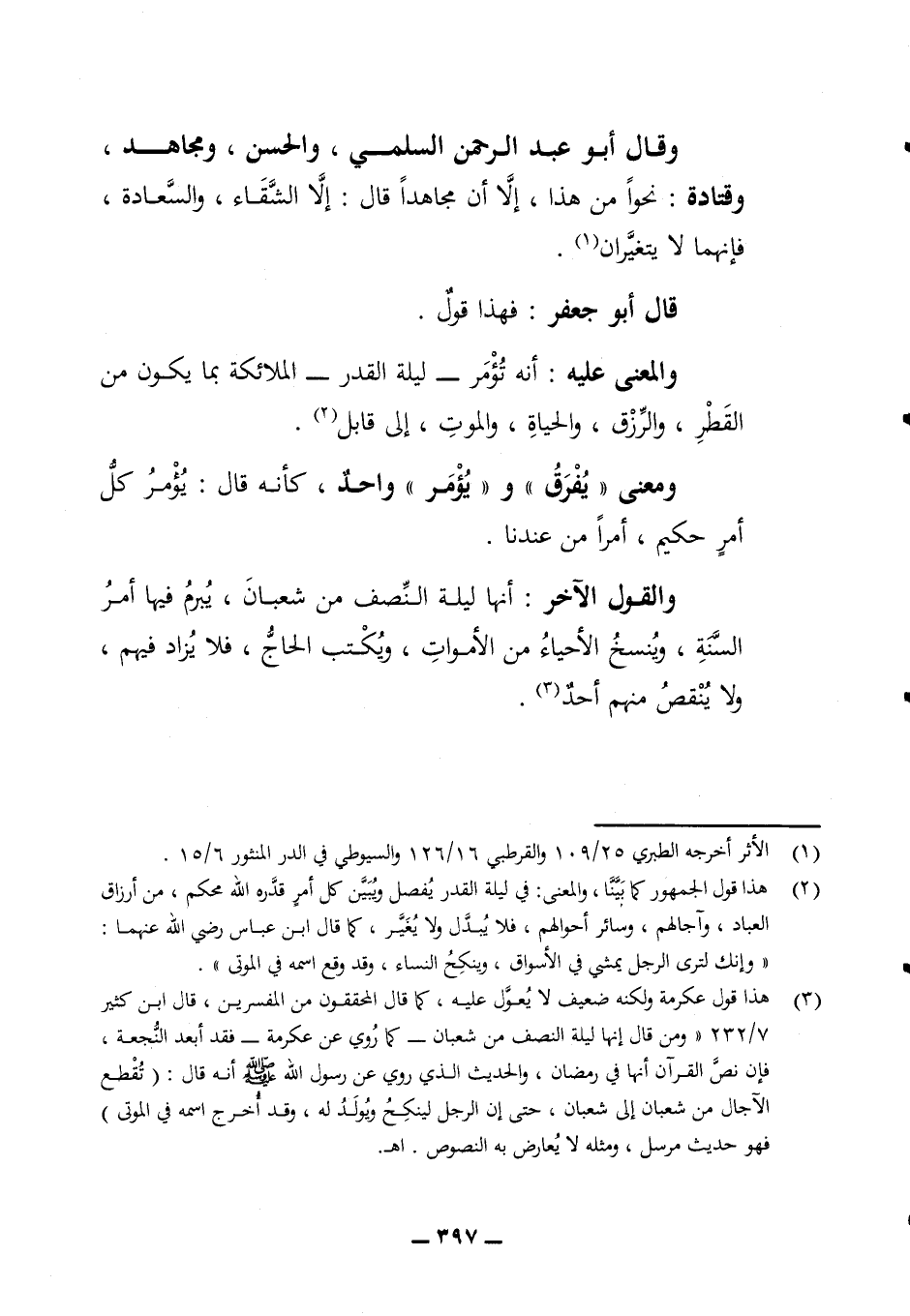 وقتادة نحوا من هذا إلا أن مجاهد قال إلا الشقاء والسعادة فإنهما لا يتغيران قال أبو جعفر فهذا قول والمعنى عليه أنه تؤمر ليلة القدر الملائكة بما يكون من القطر والرزق والحياة والموت إلى قابل ومعنى (يفرق) و (يؤمر) واحد كأنه قال يؤمر كل أمر حكيم أمرا من عندنا والقول الآخر: أنها ليلة النصف من شعبان يبرم فيها أمر السنة وينسخ الأحياء من الأموات ويكتب الحاج فلا يزاد فيهم ولا ينقص منهم أحد