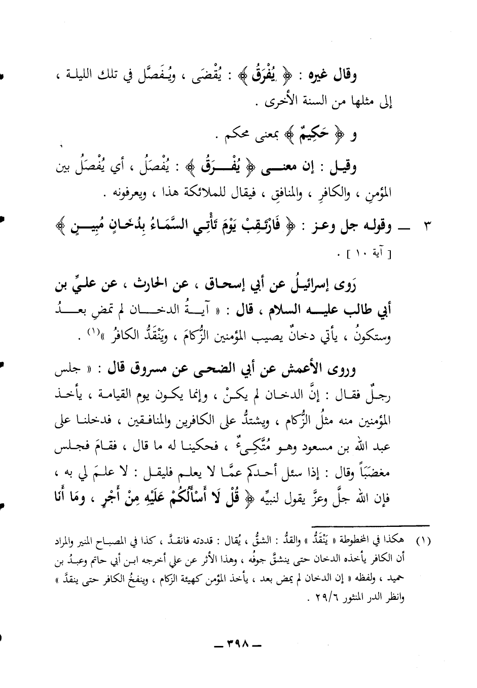وقال غيره (يفرق) يقضي ويفصل في تلك الليلة إلى مثلها من السنة الأخرى و (حكيم) بمعنى محكم وقيل إن معنى (يفرق) يفصل اي يفصل بين المؤمن والكافر والمنافق فيقال للملائكة هذا ويعرفونه 3 - وقوله جل وعز (فارتقب يوم تأتي السماء بدخان مبين) (آية 10) روى إسرائيل عن أبي إسحاق عن الحارث عن علي بن ابي طالب عليه السلام قال آية الدخان لم تمض بعد وستكون ياتي دخان يصيب المؤمنين الزكام وينقد الكافر وروى الأعمش عن ابي الضحى عن مسروق قال جلس