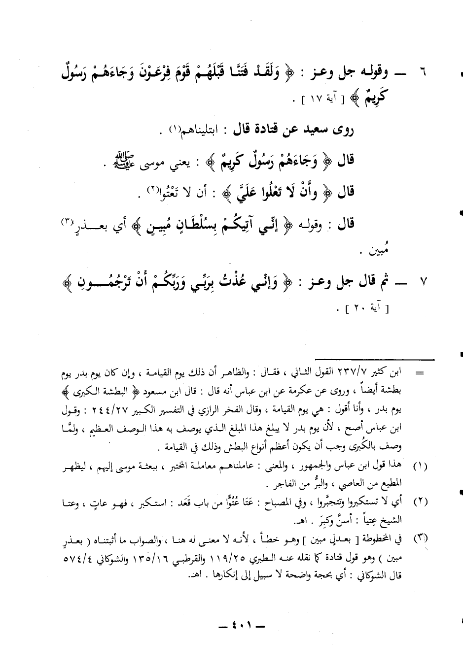 6 - وقوله جل وعز (ولقد فتنا قبلهم قوم فرعون وجاءهم رسول كريم) (آية 17) روى سعيد عن قتادة قال ابتليناهم قال (وجاءهم رسول كريم) يعني موسى صلى الله عليه وسلم قال (وأن لا تعلوا علي) أن لا تعتوا قال وقوله (إني آتيكم بسلطان مبين) اي بعذر مبين 7 - ثم قال جل وعز (وإني عذت بربي وربكم أن ترجمون) (آية 20)
