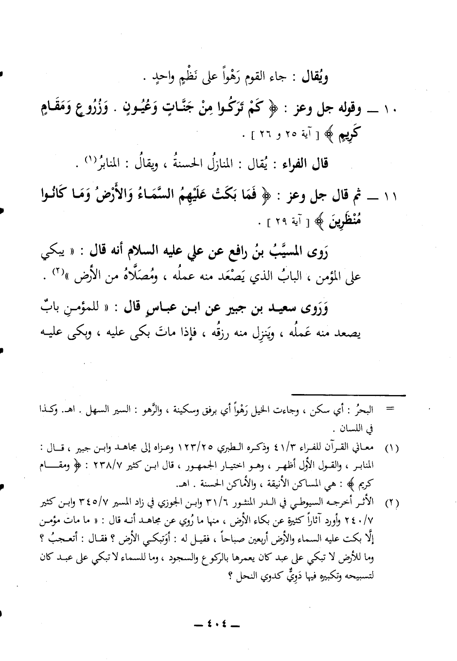 ويقال جاء القوم رهوا على نطم واحد 10 - وقوله جل وعز (كم تركوا من جنات وعيون وزروع ومقام كريم) (آية 25، 26) قال الفراء يقال المنازل الحسنة ويقال المنابر 11 - ثم قال جل وعز (فما بكت عليهم السماء والأرض وما كانوا منظرين) (آية 29) روى المسيب بن رافع عن علي عليه السلام أنه قال يبكي على المؤمن الباب الذي يصعد منه عمله ومصلاه من الأرض وروى سعيد بن جبير عن ابن عباس قال للمؤمن باب يصعد منه عمله وينزل منه رزقه فإذا مات بكى عليه وبكى عليه