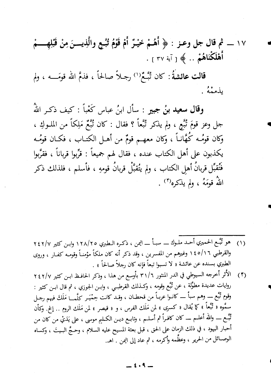 17 - ثم قال جل وعز (أهم خير أم قوم تبع والذين من قبلهم أهلكناهم) (آية 37) قالت عائشة كان تبع رجلا صالحا فذم الله قومه ولم يذممه وقال سعيد بن جبير سال ابن عباس كعبا كيف ذكر الله جل وعز قوم تبع ولم يذكر تبعا فقال كان تبع ملكا من الملوك وكان قومه كهانا وكان معهم قوم من أهل الكتاب فكان قومه يكذبون على أهل الكتاب عنده فقال لهم جميعا قربوا قربانا فقربوا فتقبل قربان اهل الكتاب ولم يتقبل قربان قومه فاسلم فلذلك ذكر الله قومه ولم يذكره
