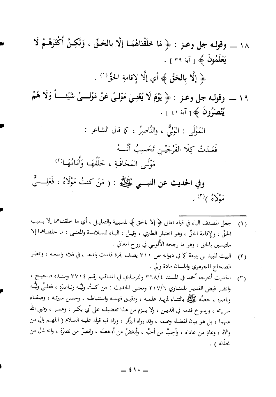 18 - وقوله جل وعز (ما خلقناهما إلا بالحق ولكن أكثرهم لا يعلمون) (آية 39) (إلا بالحق) أي إلا لإقامة الحق 19 - وقوله جل وعز (يوم لا يغني مولى عن مولى شيئا ولا هم ينصرون) (آية 41) المولى الولي والناصر كما قال الشاعر: فغدت كلا الفرجين تحسب انه * مولى المخافة خلفها وأمامها وفي الحديث عن النبي صلى الله عليه وسلم (من كنت مولاه فعلي مولاه