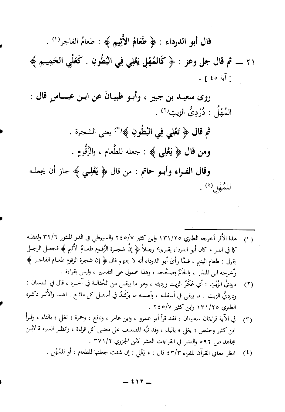 قال أبو الدرداء (طعام الأثيم) طعام الفاجر 21 - ثم قال جل وعز (كالمهل يغلي في البطون كغلي الحميم) (آية 45) روى سعيد بن جبير وابو ظبيان عن ابن عباس قال المهل دردي الزيت ثم قال (تغلي في البطون) يعني الشجرة ومن قال (يغلي) جعله للطعام والزقوم وقال الفراء وأبو حاتم من قال (يغلي) جاز أن يجعله للمهل