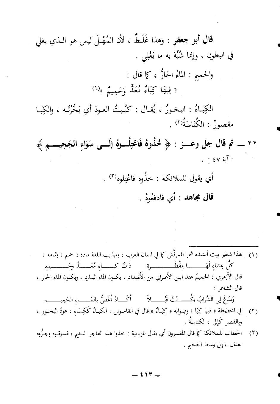 قال أبو جعفر وهذا غلط لأن المهل ليس هو الذي يغلي في البطون وإنما شبه به ما يغلي والحميم الماء الحار كما قال: (فيها كباء معد وحميم) الكباء البخور يقال كببت العود اي بخرته والكبا مقصور الكناسة 22 - ثم قال جل وعز (خذوه فاعتلوه إلى سواء الجحيم) (آية 47) أي يقول للملائكة خذوه فاعتلوه قال مجاهد أي فادفعوه
