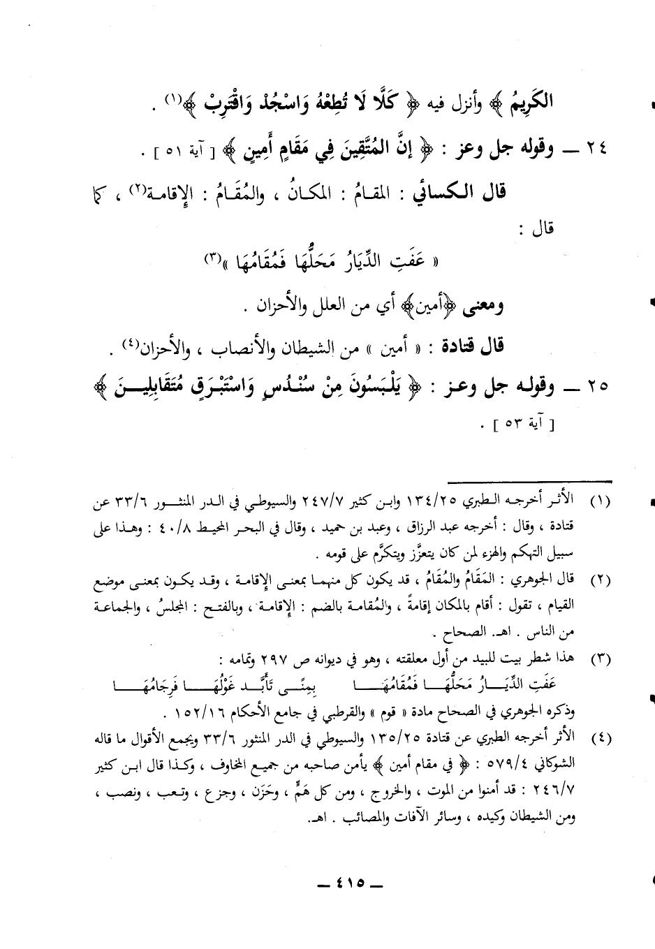 الكريم) وأنزل فيه (كلا لا تطعه واسجد واقترب) 24 - وقوله جل وعز (إن المتقين في مقام أمين) (آية 51) قال الكسائي المقام لمكان والمقام الإقامة كما قال: (عفت الديار محلها فمقامها) ومعنى (أمين) أي من العلل والأحزان قال قتادة أمين من الشيطان والأنصاب والأحزان 25 - وقوله جل وعز (يلبسون من سندس واستبرق متقابلين) (آية 53)
