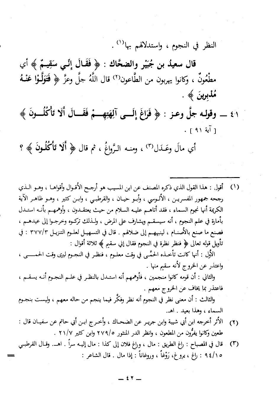 النظر في النجوم واستدلالهم بها قال سعيد بن جبير والضحاك (فقال إني سقيم) أي مطعون وكاتوا) يهربون من الطاعون قال الله جل وعز (فتولوا عنه مدبرين) 41 - وقوله جل وعز (فراغ إلى آلهتهم فقال ألا تأكلون) (آية 91) أي مال وعدل ومنه الرواغ ثم قال (ألا تأكلون)