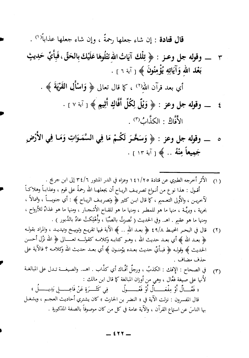قال قتادة إن شاء جعلها رحمة وإن شاء جعلها عذابا 3 - وقوله جل وعز (تلك آيات الله نتلوها عليك بالحق فبأي حديث بعد الله وآياته يؤمنون) (آية 6) أي بعد قرآن الله كما قال تعالى (واسأل القرية) 4 - وقوله جل وعز (ويل لكل أفاك أثيم) (آية 7)